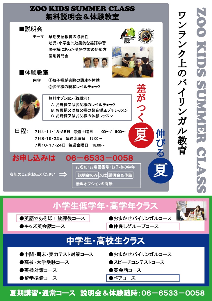 >☆お子様向け夏期講習「ZOO KIDS SUMMER CLASS」開校決定!☆ 2015-06-26 16:33:30